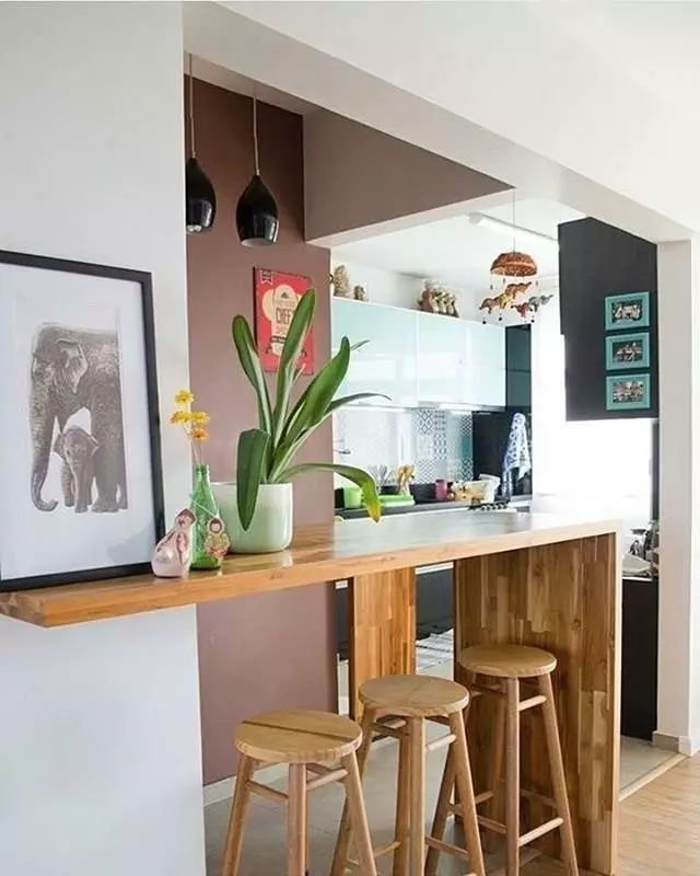 当然,吧台也并不是非得与厨房绑定在一起,家里有适合的空间都能让它发挥作用,比如它还能搭配上储物柜,摆上家里的零碎物件,收纳作用也不错。