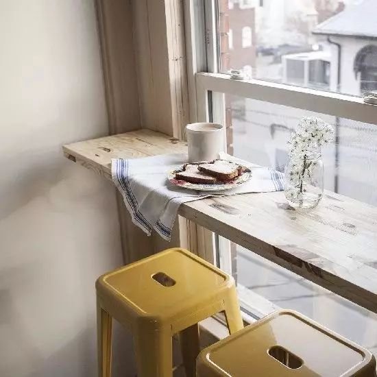 如果你希望家里有飘窗但是事与愿违无法拥有,那试试在窗边钉上一块木隔板吧,这不就成一个小吧台了么!