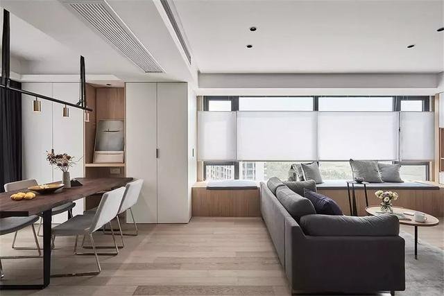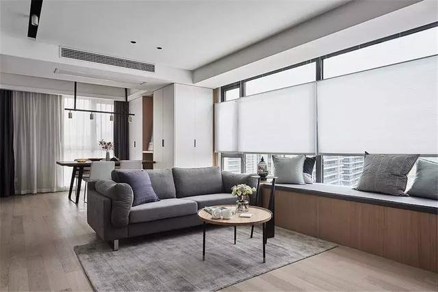 ▲ 靠窗做了一排的飘窗兼作客厅的桌椅与休闲区,铺上灰色布艺的坐垫,整个客厅给人以舒适的惬意感。