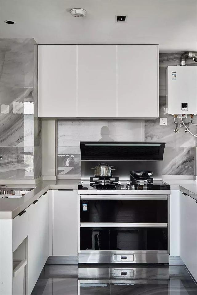 灰色大理石质感的墙面、地面砖,搭配白色橱柜与黑色电器,简约又时尚。
