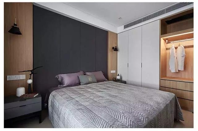 ▲ 卧室床头以灰黑色+两侧木饰面为背景,搭配侧边白色衣柜门,整体简约的空间在木色与暖光的衬托下,流露出温馨的氛围感。