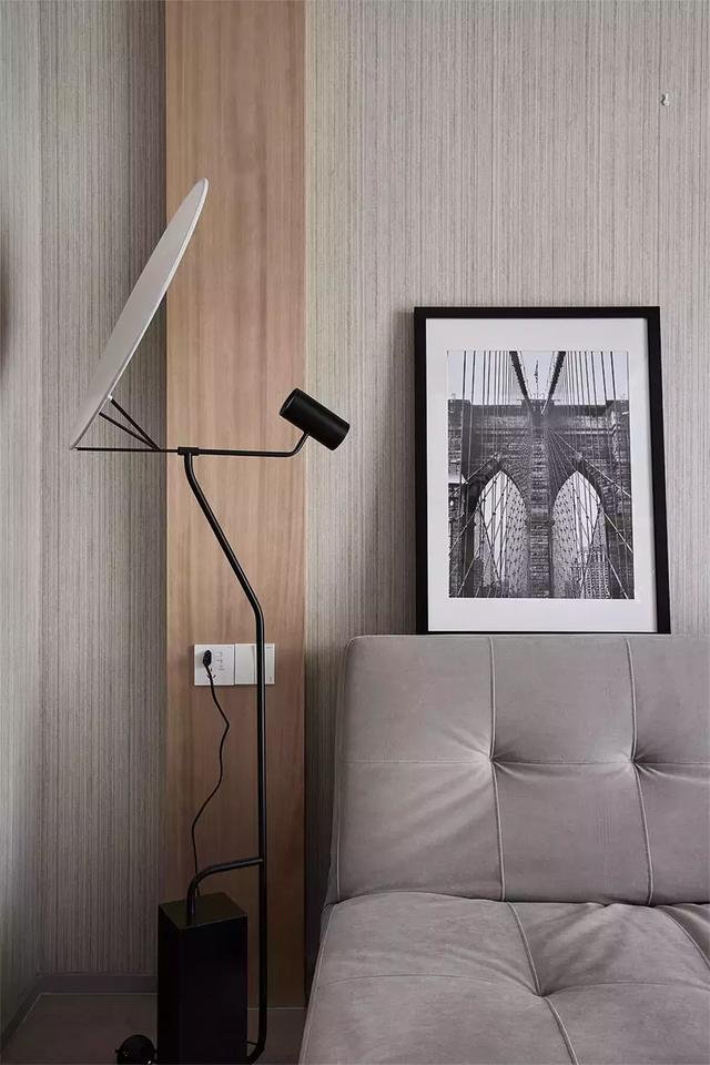 ▲ 床头两侧木色的墙面对称地装上了壁灯,结合灰色窗帘与床头柜颜色的相互映衬,让卧室显得格外的安静优雅。