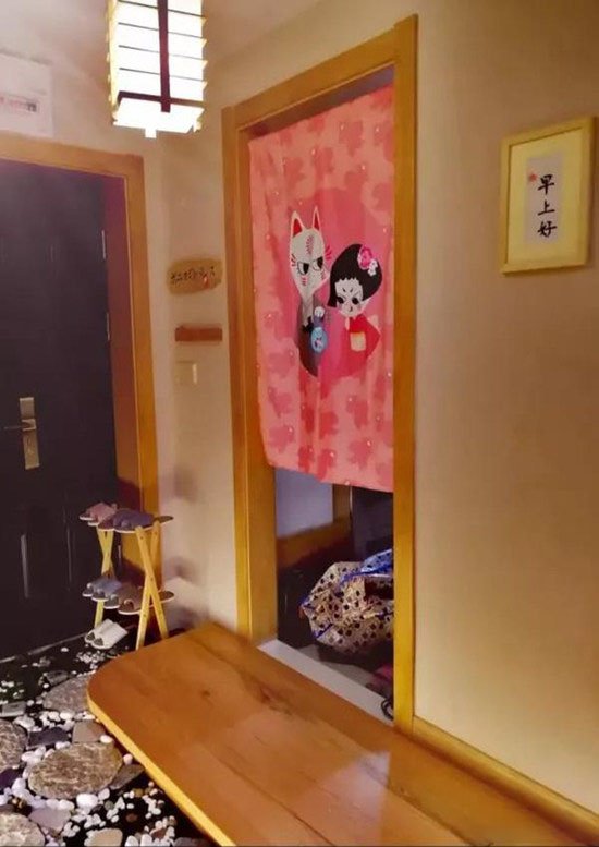 【厨房】厨房没有做门,而是使用了和风的门帘,厨房里面简约的橱柜搭配可翻折的集成灶,让整体空间显得更整洁。