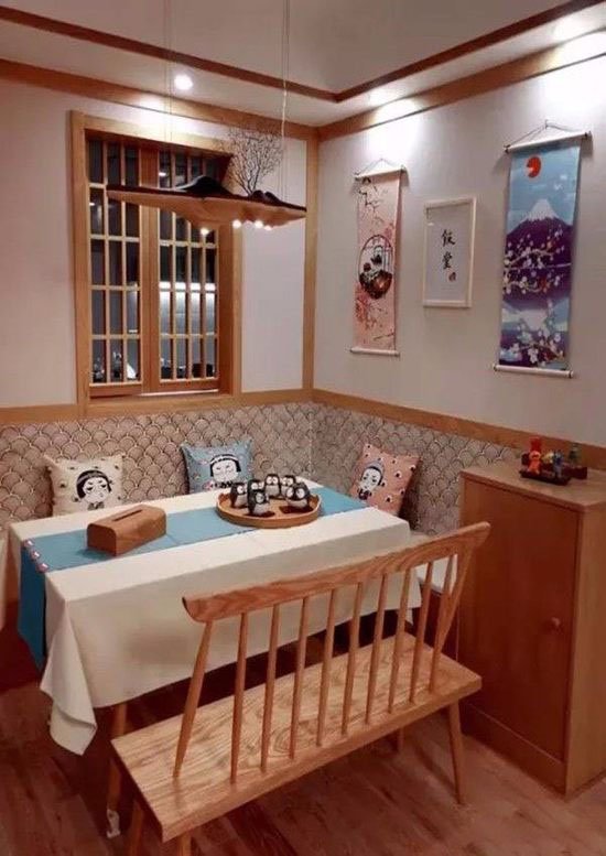 【餐厅】餐厅利用转角空间设计了L型卡座,不仅能很好地节省空间,还能够增加存储空间,非常实用。墙面上特意选择了和风挂画,搭配一幅毛笔字写的“饭堂”装饰,具有很好的效果。