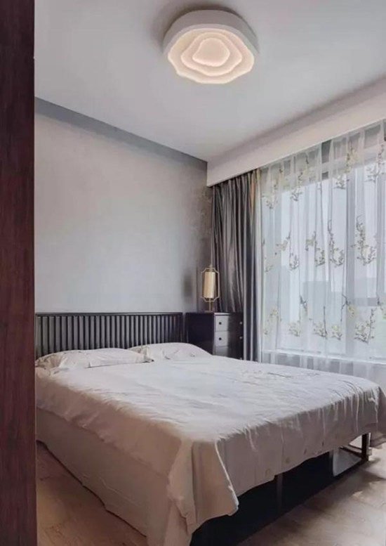 【次卧】次卧室的设计带点新中式的感觉,木色到顶衣柜作为次卧室的存储空间,简约自然又实用。而窗帘选择的是中式刺绣图案,显得很雅致。