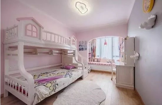 【儿童房】儿童房的设计显得比较粉嫩,粉色的墙面搭配白色的上下铺和书桌,实用又好看。另外飘窗处榻榻米的设计,既可以作为休息区也能作为娱乐区,舒适实用。