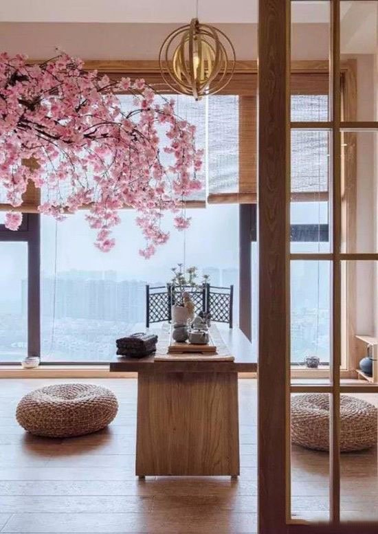 【阳台】阳台可以说是很有特色的一个地方,既是书房也是茶室,同时还是瑜伽室,功能性非常强大。一棵樱花装饰树摆放其中,日式韵味十足。