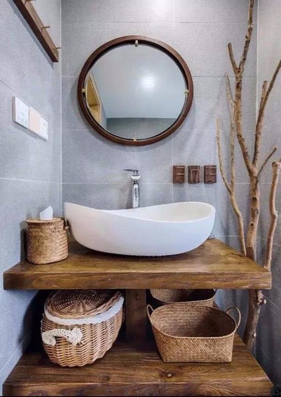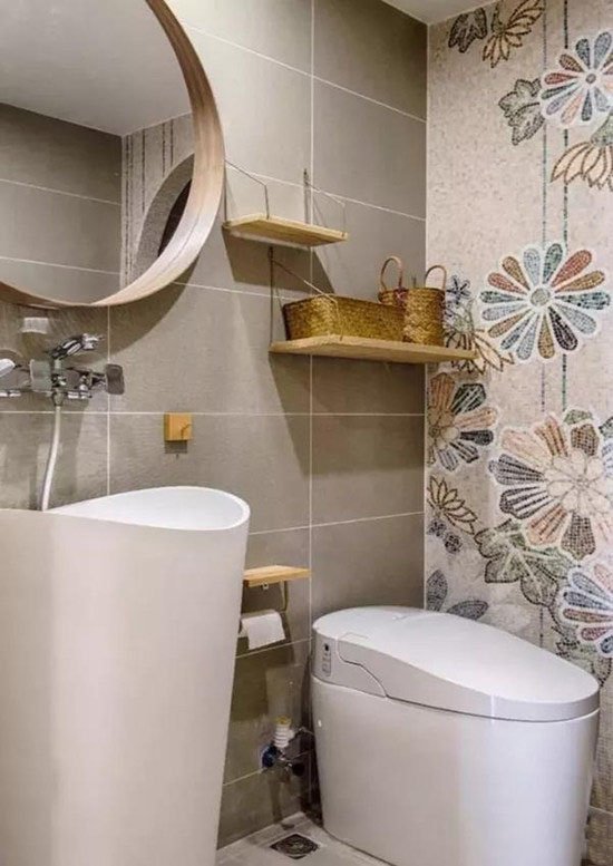 【次卫】次卫设计了一个圆弧形门洞作为干湿区的隔断,立柱式的洗手盆虽然没有储物空间,但显得很有设计感,墙面上的隔板以及竹篮作为次卫的收纳空间,小巧精致。