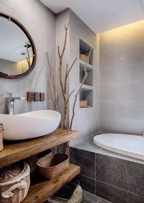 【主卫】主卫中白色的浴缸和洗手盆、榆木台面、黑胡桃木镜框以及树枝造型,大量木元素的设计让卫生间看起来自然又舒适。